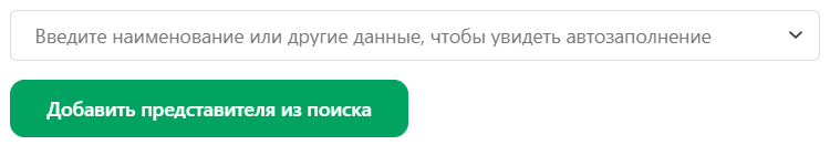 - Поиск по реквизитам для Юр. лиц и ИП. Нажмите кнопку «Добавить представителя из поиска». Введите в поисковую строку ИНН или наименование Юридического лица или Индивидуального предпринимателя (ИП). Сервис успешно найдет организацию или ИП, её данные подгрузятся автоматически.