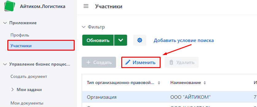 При первом входе требуется зайти в раздел «Участник», после чего требуется выделить организацию и нажать клавишу «Изменить».