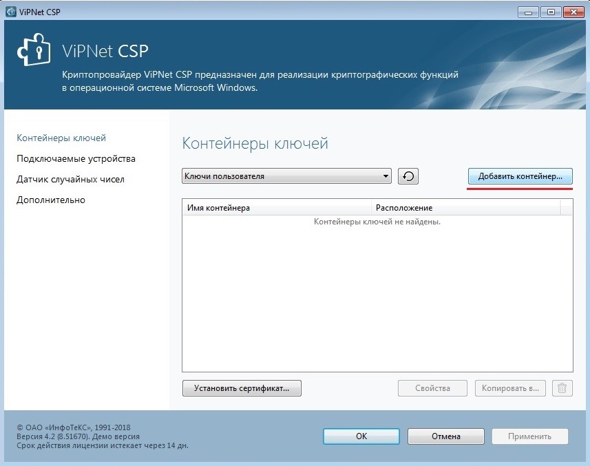 Во вкладке «Контейнеры ключей» нажмите кнопку «Добавить контейнер…» (Рис. 1).