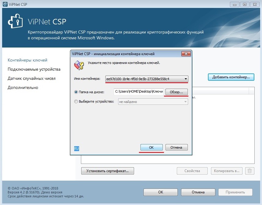 Если Вам необходимо добавить контейнер в VipNet CSP, сохраненный в директории на компьютере/флешке, выполните следующие действия: