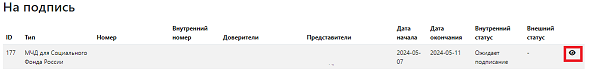 Открыв раздел, для подписания необходимо выбрать интересующую нас доверенность, чтобы открыть ее нажмите на значок «глаза».