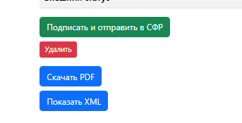 | В случае если кнопка «Подписать и отправить в СФР» отсутствует, значит пользователь не обладает типом членства «Доверитель», либо он в выписке организации не является лицом, имеющим права действовать без доверенности. |