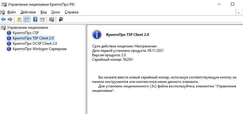 Необходимо открыть приложение «Управление лицензиями КриптоПро PKI и выбрать раздел КриптоПро TSP Client 2.0.