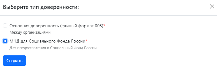 Выберите «МЧД для Социального Фонда России» и нажмите создать.