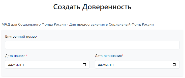 В открывшемся окне заполните «Внутренний номер» (при необходимости) и дату начала и дату окончания доверенности.