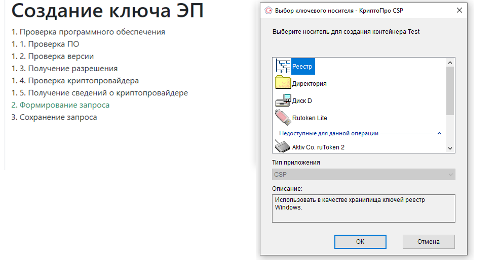 В появившемся окне выберите носитель, предназначенный для записи электронной подписи и нажмите кнопку «ок».