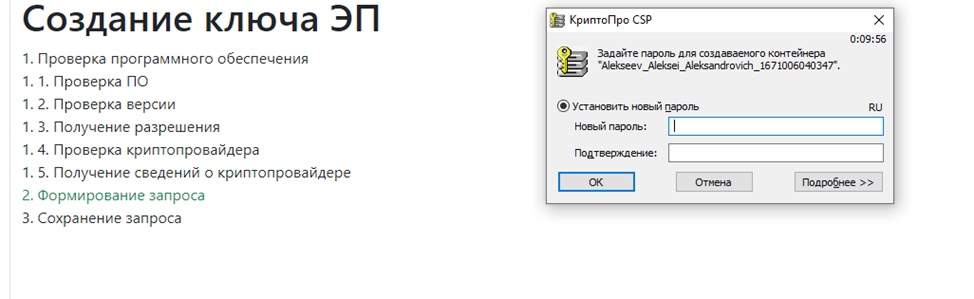 Если запись КЭП производится на незащищенный носитель (флеш-карта, реестр и т.д.) вместо ввода pin-код, Вам будет предложено его задать. Задайте его и нажмите «ОК». Если Вы хотите не задавать pin-код, оставьте поля ввода пустыми.