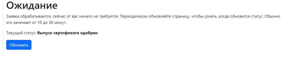 Выпуск сертификата осуществляется автоматически. Периодически обновляйте страницу, чтобы узнать, когда обновится статус. Обычно это занимает от 10 минут.