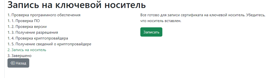 На заключающим этапе необходимо установить СКПЭП на ключевой носитель, нажав на клавишу «Записать на ключевой носитель».