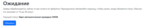 Начнется автоматическая проверка данных через СМЭВ. Проверка занимает от 10 минут. Страница обновиться автоматически.