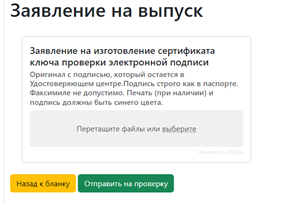 При успешном прохождении проверки, система предложит загрузить заявление для дальнейшей его печати и подписи, либо для подписи его действующей электронной подписью (Инструкция как подписать документ электронной подписью)