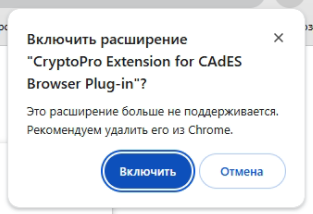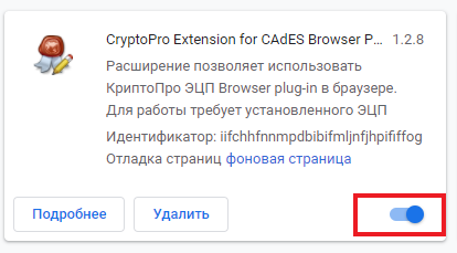 Откроется меню расширений, найдите CryptoPro Extension for CAdES Browser Plug-in и поставьте галочку напротив «Включить».