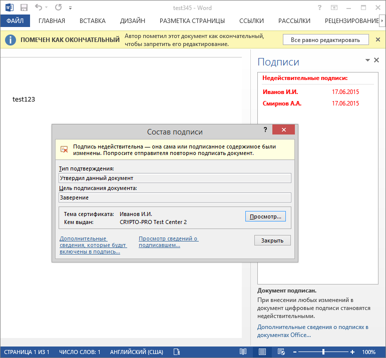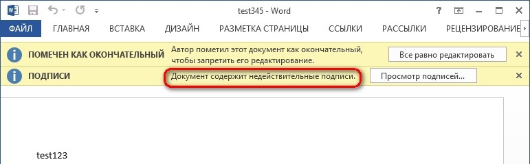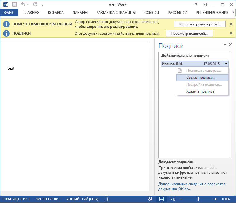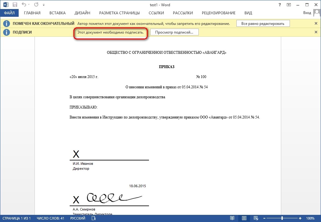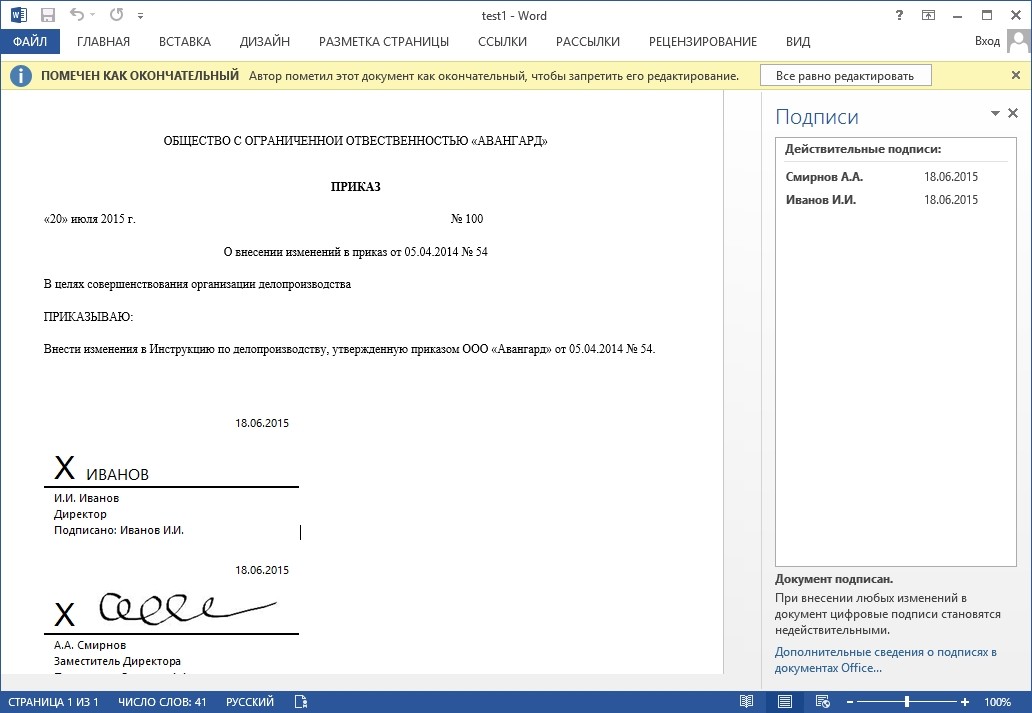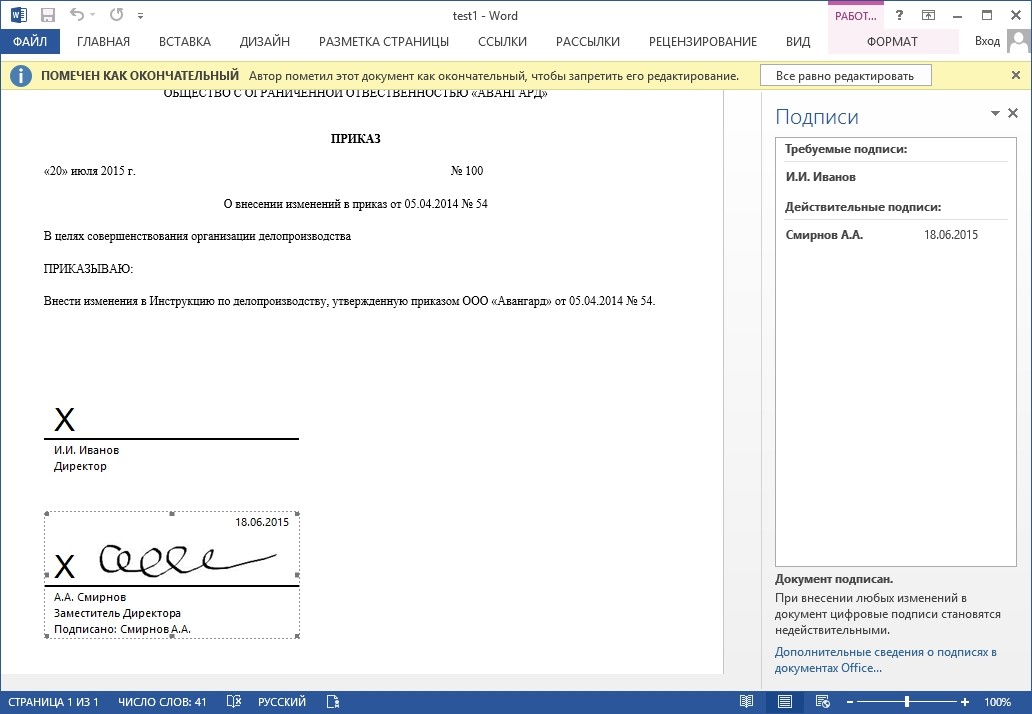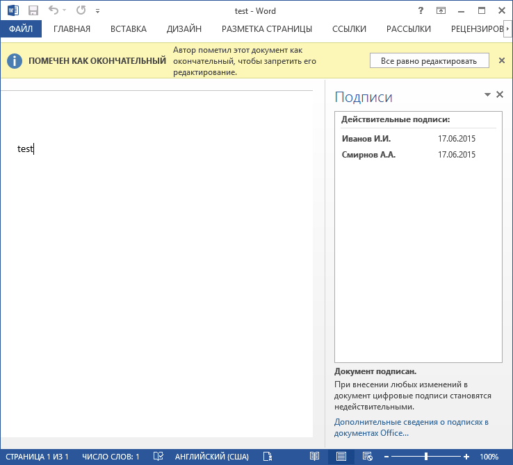 После того, как в документе появилась первая (или единственная) цифровая подпись, он автоматически помечается как окончательный и доступен только для чтения.