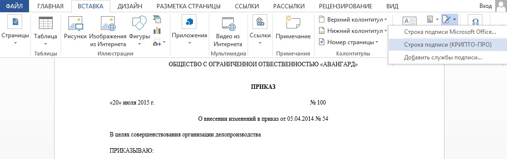 На вкладке Вставка в группе Текст нажмите на стрелку рядом с кнопкой Строка подписи и в появившемся меню выберите Строка электронной подписи (КРИПТО-ПРО).