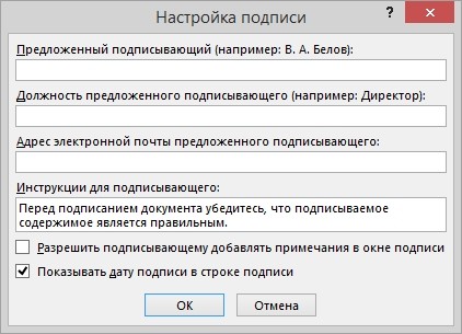 В нём можно ввести информацию о лице, которое будет добавлять подпись. Эти сведения будут отображены в строке подписи в документе. Заполнять все пункты не обязательно.
