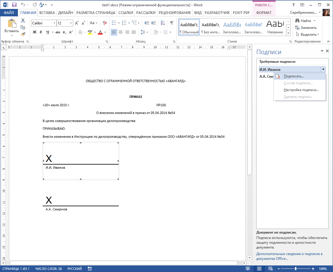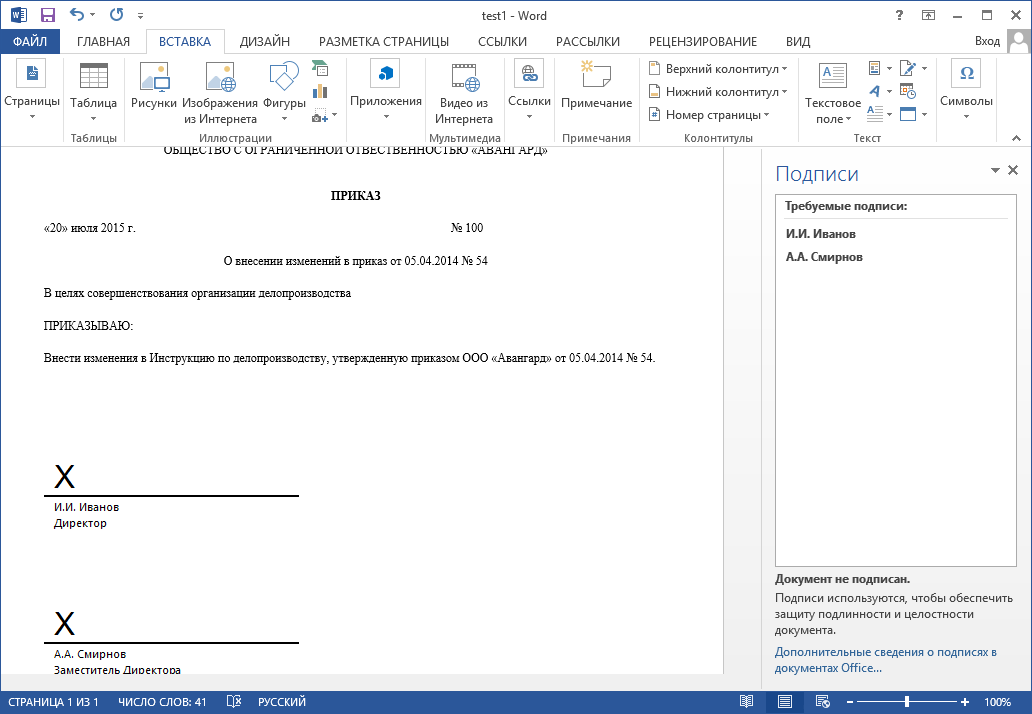 Рисунок 31. Документ с подписями, удалёнными в результате редактирования