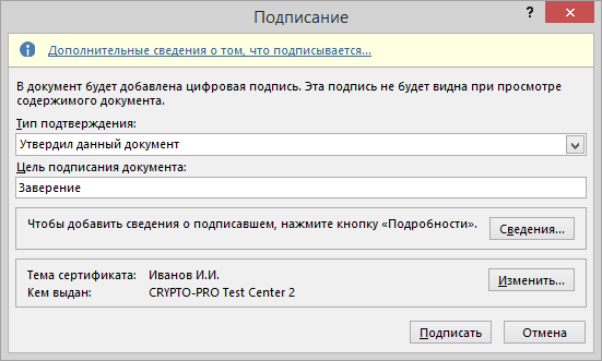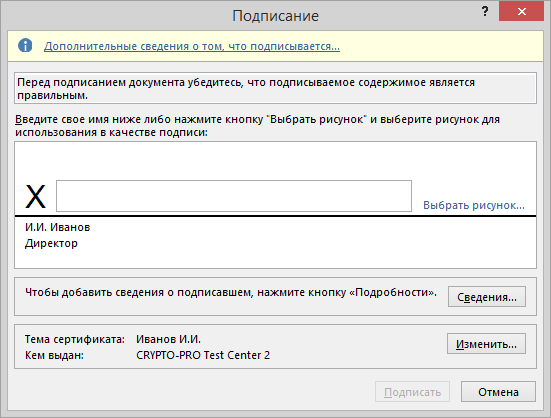 В верхней части окна можно просмотреть дополнительные сведения о создаваемой подписи нажав ссылку Дополнительные сведения о том, что подписывается…