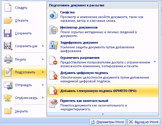 Для создания неотображаемой электронной подписи в Microsoft Office Word 2007 или Excel 2007 в главном меню выберите пункт Подготовить, затем Добавить электронную подпись (КРИПТО-ПРО).