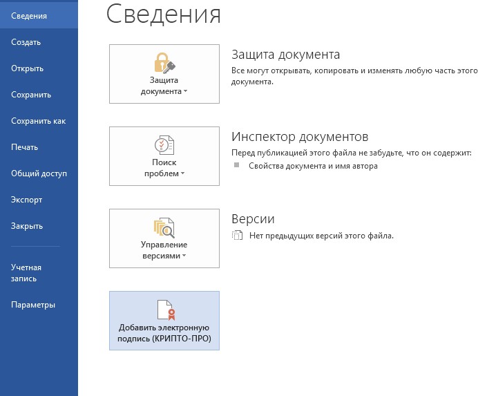 Для добавления новой ЭП в Microsoft Office Word 2010/2013/2016 или Excel 2010/2013/2016 на вкладке Файл в разделе Сведения нажмите кнопку Добавить электронную подпись (КРИПТО-ПРО).