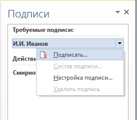 Для добавления подписи в строку подписи дважды щелкните по строке подписи в тексте документа, либо выберите действие Подписать в контекстном меню элемента, либо в панели Подписи нажмите правой кнопкой мыши на нужной строке подписи и выберите команду Подписать.