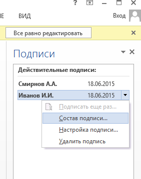Если открыть документ для редактирования, все подписи удаляются, об этом выводится предупреждение.