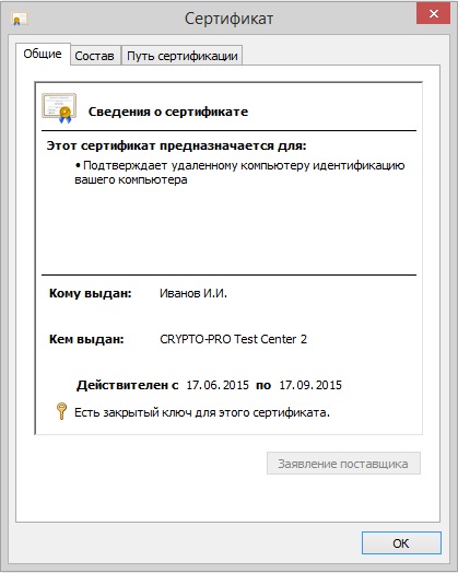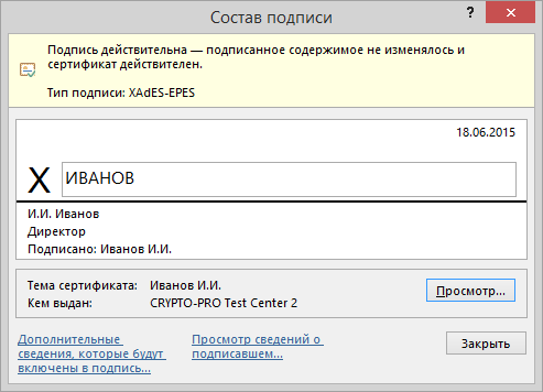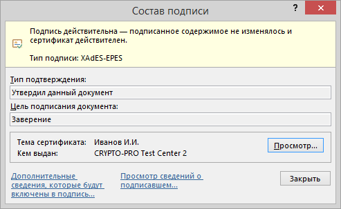 Для просмотра сертификата, использовавшегося при создании подписи, нажмите кнопку