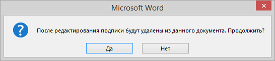 Если нажать кнопку Да, то любое действие по редактированию документа приведёт к тому, что все подписи из документа будут удалены.