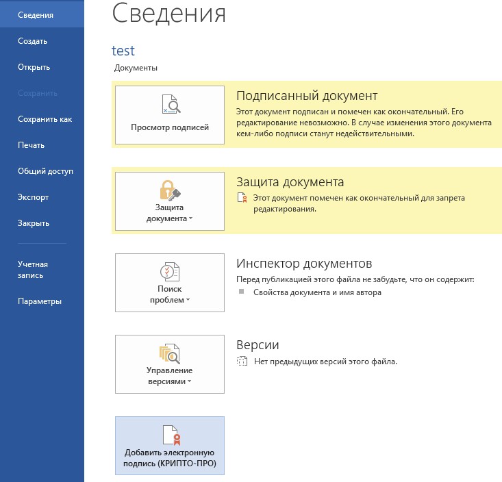 После подписи документа в меню Файл, разделе Сведения выводится информация о том, что документ подписан и редактирование запрещено.