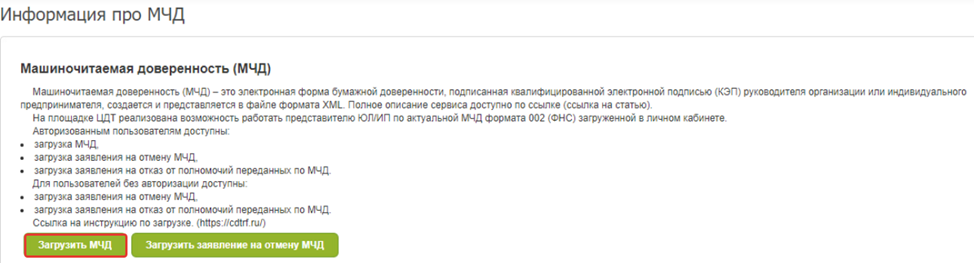 Чтобы загрузить МЧД, необходимо кликнуть по кнопке «Загрузить МЧД».