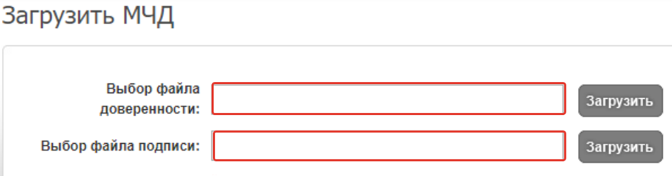 На странице загрузки МЧД требуется предоставить два файла: сам файл доверенности в формате XML и файл электронной подписи к нему в формате SIG.