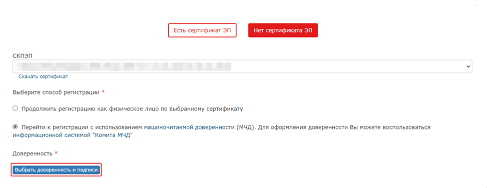 Чтобы перейти к регистрации с использованием машиночитаемой доверенности, выберите пункт «Регистрация с МЧД». После этого появится поле для загрузки файла с доверенностью.