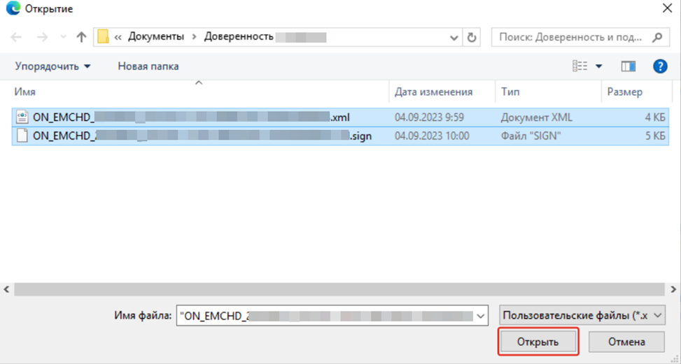 Нажмите на кнопку «Выбрать файл» рядом с полем «Доверенность» и выберите необходимые файлы.