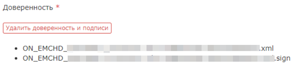 Для удаления ранее загруженных файлов доверенности и подписи нажмите на кнопку «Удалить доверенность и подписи». После этого вы сможете загрузить новые файлы.