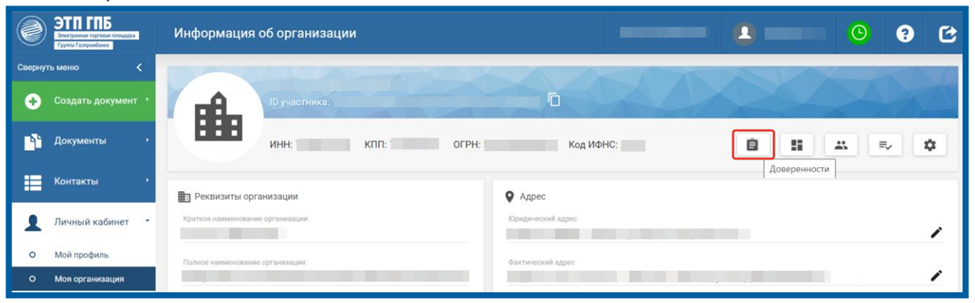 Для инициации процедуры загрузки машиночитаемой доверенности руководителем организации необходимо перейти в раздел личного кабинета «Моя организация». В открывшемся окне, содержащем подробную информацию об организации, нажмите кнопку «Доверенности».