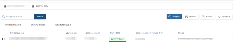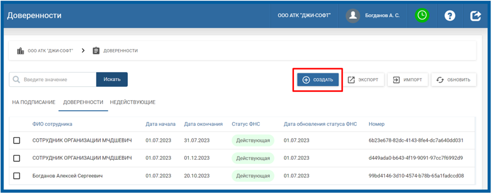 Вы увидите список всех оформленных доверенностей, с возможностью поиска.