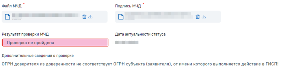 В случае неуспешного прохождения проверки необходимо внести соответствующие исправления в МЧД, загрузить обновленный файл и запустить процедуру проверки повторно.