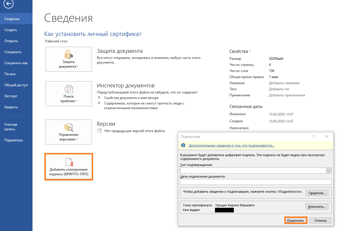 1. Перейдите на вкладку «Файл», откройте «Сведения» и нажмите «Добавить электронную подпись (КРИПТО-ПРО)».