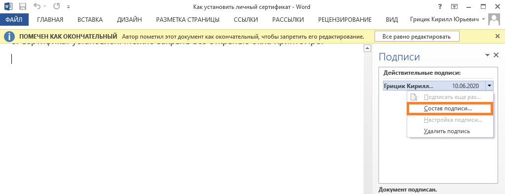 Нажмите «Файл/Сведения/Просмотр подписей». В окне «Подписи» проверьте, кто и когда подписал документ. Чтобы получить подробную информацию о подписи, кликните по ней правой кнопкой мыши и выберите «Состав подписи».