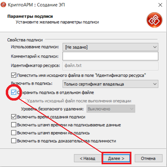 6. На этом шаге необходимо поставить галочку в пункте «Сохранить подпись в отдельном файле» и нажмите «Далее»