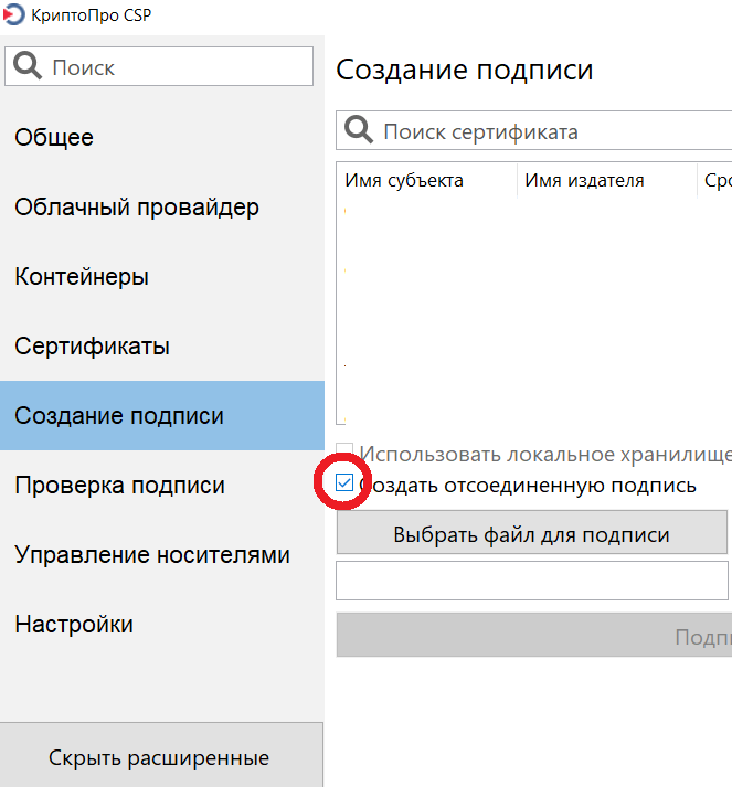 4. Поставьте галочку в пункте «Создать отсоединенную подпись»