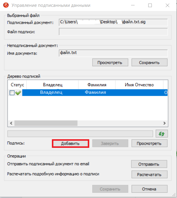 - Для того чтобы подписать документ второй ЭП необходимо открыть уже имеющийся подписанный файл и нажать «Добавить»