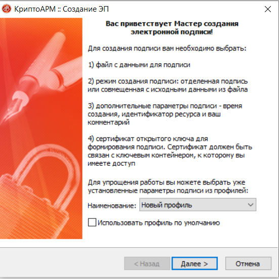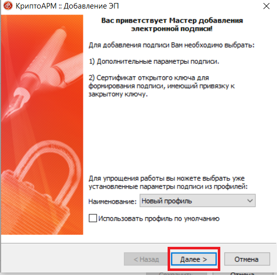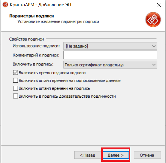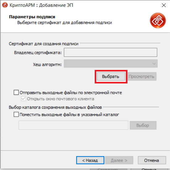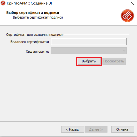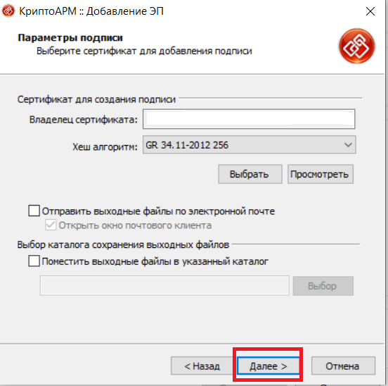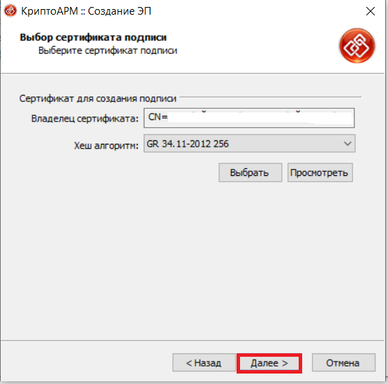 7. Теперь необходимо «Выбрать» вашу подпись которой требуется подписать файл и нажать «Далее»