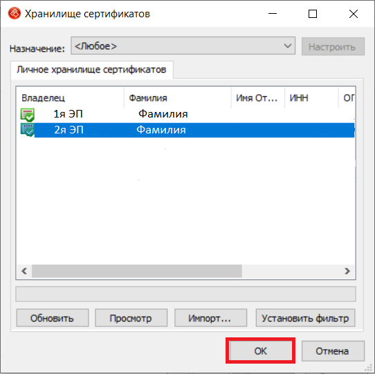 4. Теперь нажмите «Выбрать» и выберите 2ю подпись для подписания из списка ваших подписей, после выбора нажмите «ОК»