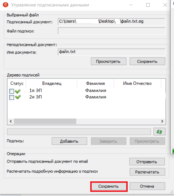 6. Теперь ваш файл подписан двумя электронными подписями, нажмите «Сохранить»
