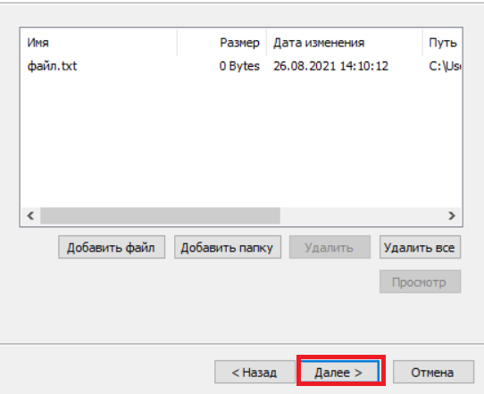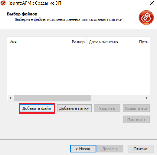 3. Нажмите «Далее» и на следующем шаге нажмите «Добавить файл» и выберете файл который необходимо подписать открепленной подписью.