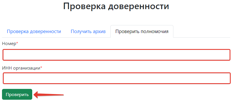 Заполните номер (36 значный уникальный номер доверенности) и ИНН организации (Доверителя) и нажмите кнопку проверить.