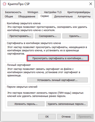 3. Нажмите «Просмотреть сертификат в контейнере».