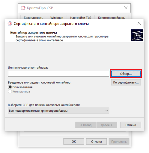 5. Выберите ключевой контейнер с Вашим сертификатом, нажмите «ОК», затем «Далее».