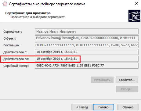 6. Отобразится информация по сертификату из выбранного контейнера с его сроком действия.