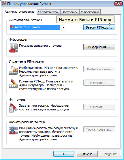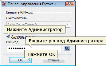 2. Выберите Администратор и введите pin-код. Стандартный pin-код администратора на ruToken: 87654321.